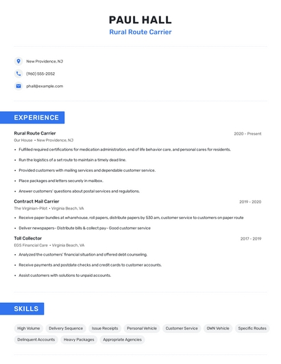 Build a professional rural route carrier resume in minutes. Our AI resume writing assistant will guide you through every step of the process, and you can choose from 10+ resume templates to create your rural route carrier resume.7. Mail Truck