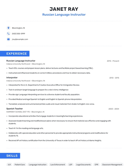Build a professional russian language instructor resume in minutes. Browse through our resume examples to identify the best way to word your resume. Then choose from 5+ resume templates to create your russian language instructor resume.