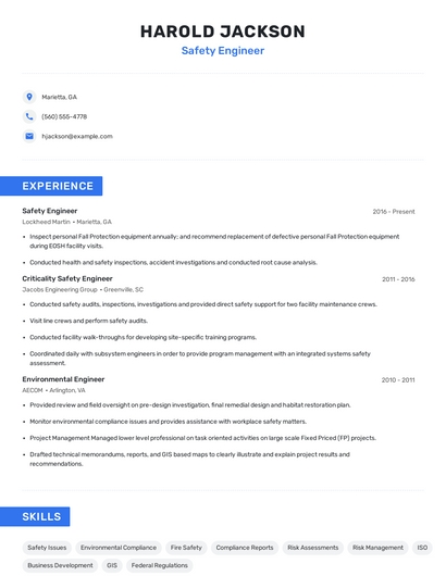 Build a professional safety engineer resume in minutes. Browse through our resume examples to identify the best way to word your resume. Then choose from 5+ resume templates to create your safety engineer resume.