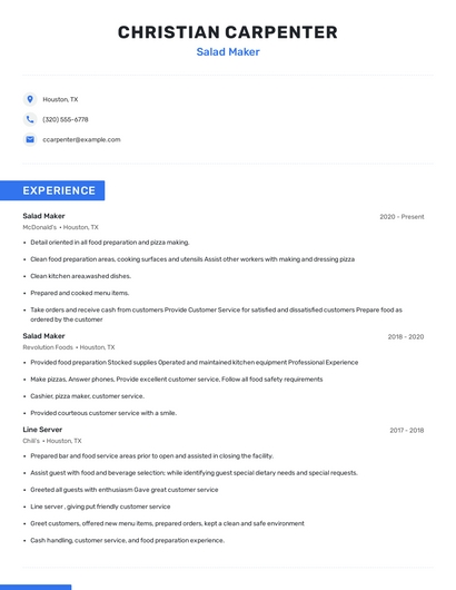 Build a professional salad maker resume in minutes. Browse through our resume examples to identify the best way to word your resume. Then choose from 5+ resume templates to create your salad maker resume.