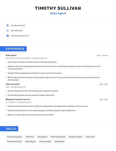 Build a professional sales agent resume in minutes. Browse through our resume examples to identify the best way to word your resume. Then choose from 5+ resume templates to create your sales agent resume.