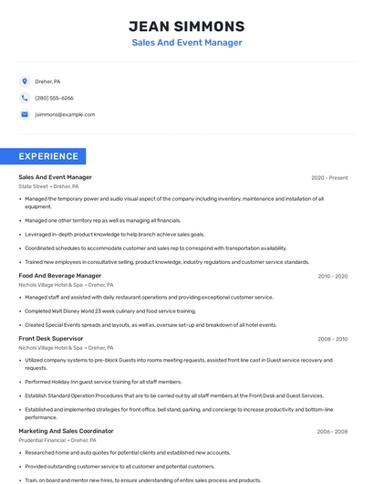 Build a professional sales and event manager resume in minutes. Browse through our resume examples to identify the best way to word your resume. Then choose from 5+ resume templates to create your sales and event manager resume.