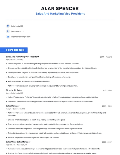 Build a professional sales and marketing vice president resume in minutes. Browse through our resume examples to identify the best way to word your resume. Then choose from 5+ resume templates to create your sales and marketing vice president resume.