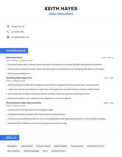 Build a professional sales consultant resume in minutes. Browse through our resume examples to identify the best way to word your resume. Then choose from 5+ resume templates to create your sales consultant resume.