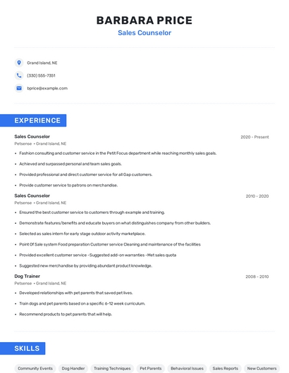 Build a professional sales counselor resume in minutes. Browse through our resume examples to identify the best way to word your resume. Then choose from 5+ resume templates to create your sales counselor resume.