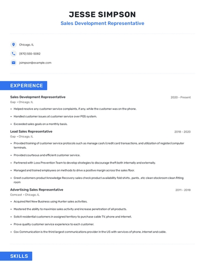 Build a professional sales development representative resume in minutes. Browse through our resume examples to identify the best way to word your resume. Then choose from 5+ resume templates to create your sales development representative resume.