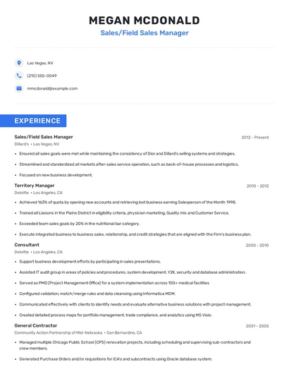 Build a professional sales/field sales manager resume in minutes. Browse through our resume examples to identify the best way to word your resume. Then choose from 5+ resume templates to create your sales/field sales manager resume.