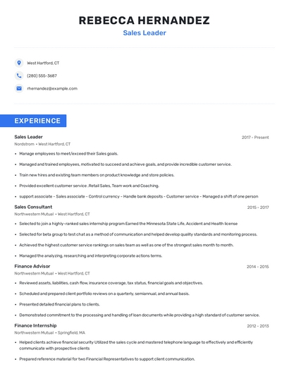 Build a professional sales leader resume in minutes. Browse through our resume examples to identify the best way to word your resume. Then choose from 5+ resume templates to create your sales leader resume.