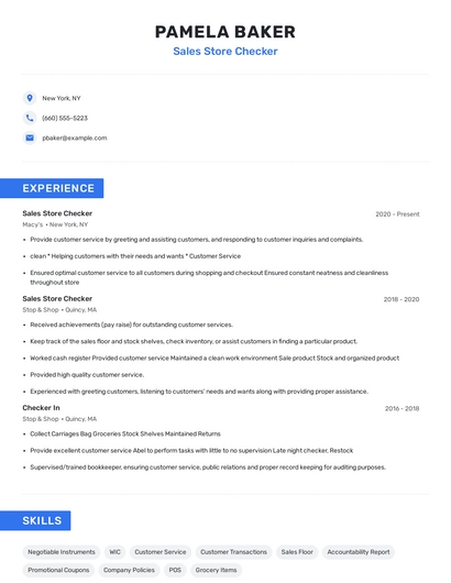 Build a professional sales store checker resume in minutes. Browse through our resume examples to identify the best way to word your resume. Then choose from 5+ resume templates to create your sales store checker resume.