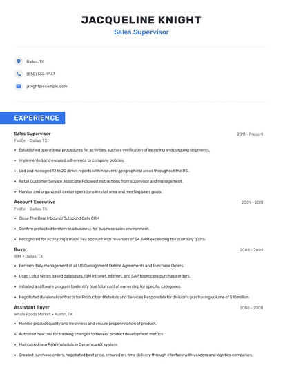 Build a professional sales supervisor resume in minutes. Browse through our resume examples to identify the best way to word your resume. Then choose from 5+ resume templates to create your sales supervisor resume.
