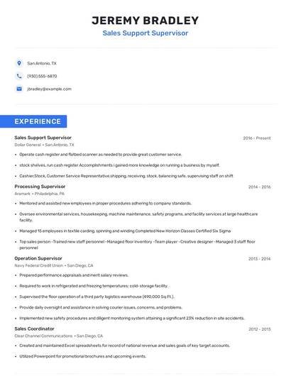 Build a professional sales support supervisor resume in minutes. Browse through our resume examples to identify the best way to word your resume. Then choose from 5+ resume templates to create your sales support supervisor resume.