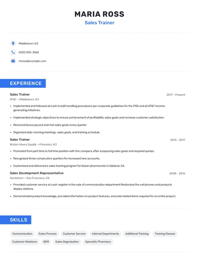 Build a professional sales trainer resume in minutes. Browse through our resume examples to identify the best way to word your resume. Then choose from 5+ resume templates to create your sales trainer resume.