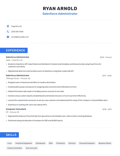 Build a professional salesforce administrator resume in minutes. Browse through our resume examples to identify the best way to word your resume. Then choose from 5+ resume templates to create your salesforce administrator resume.