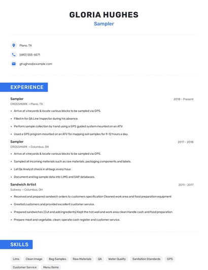 Build a professional sampler resume in minutes. Browse through our resume examples to identify the best way to word your resume. Then choose from 5+ resume templates to create your sampler resume.