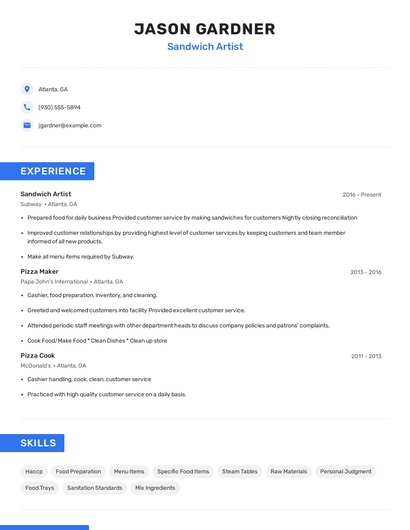 Build a professional sandwich artist resume in minutes. Browse through our resume examples to identify the best way to word your resume. Then choose from 5+ resume templates to create your sandwich artist resume.