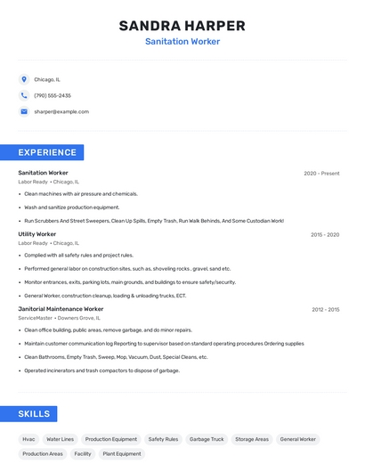 Build a professional sanitation worker resume in minutes. Browse through our resume examples to identify the best way to word your resume. Then choose from 5+ resume templates to create your sanitation worker resume.