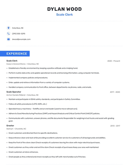 Build a professional scale clerk resume in minutes. Browse through our resume examples to identify the best way to word your resume. Then choose from 5+ resume templates to create your scale clerk resume.