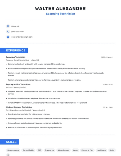 Build a professional scanning technician resume in minutes. Browse through our resume examples to identify the best way to word your resume. Then choose from 5+ resume templates to create your scanning technician resume.