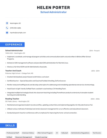 Build a professional school administrator resume in minutes. Browse through our resume examples to identify the best way to word your resume. Then choose from 5+ resume templates to create your school administrator resume.