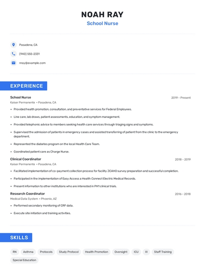 Build a professional school nurse resume in minutes. Browse through our resume examples to identify the best way to word your resume. Then choose from 5+ resume templates to create your school nurse resume.