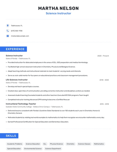 Build a professional science instructor resume in minutes. Browse through our resume examples to identify the best way to word your resume. Then choose from 5+ resume templates to create your science instructor resume.