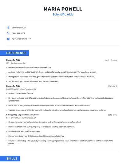 Build a professional scientific aide resume in minutes. Browse through our resume examples to identify the best way to word your resume. Then choose from 5+ resume templates to create your scientific aide resume.