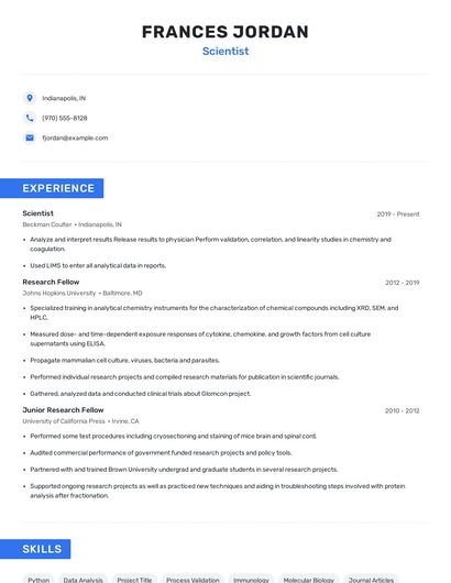 Build a professional scientist resume in minutes. Browse through our resume examples to identify the best way to word your resume. Then choose from 5+ resume templates to create your scientist resume.