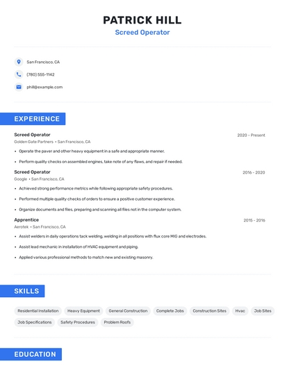 Build a professional screed operator resume in minutes. Our AI resume writing assistant will guide you through every step of the process, and you can choose from 10+ resume templates to create your screed operator resume.7. Screeds