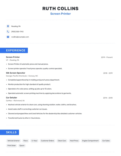 Build a professional screen printer resume in minutes. Browse through our resume examples to identify the best way to word your resume. Then choose from 5+ resume templates to create your screen printer resume.