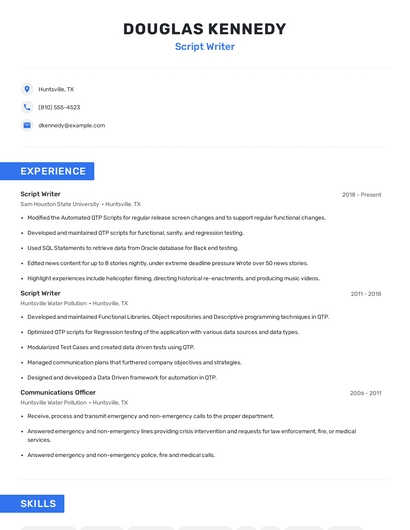 Build a professional script writer resume in minutes. Browse through our resume examples to identify the best way to word your resume. Then choose from 5+ resume templates to create your script writer resume.