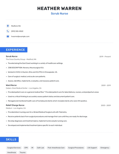 Build a professional scrub nurse resume in minutes. Browse through our resume examples to identify the best way to word your resume. Then choose from 5+ resume templates to create your scrub nurse resume.