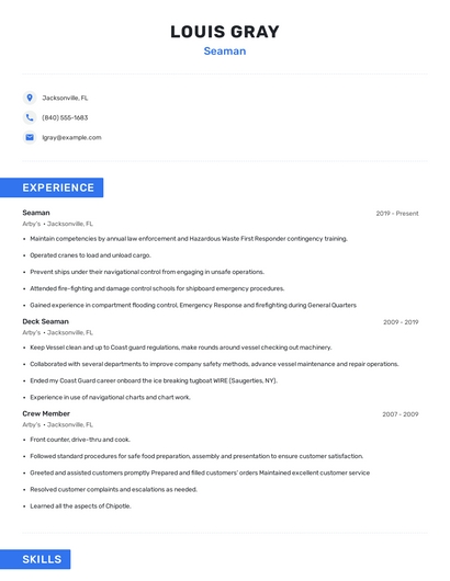 Build a professional seaman resume in minutes. Browse through our resume examples to identify the best way to word your resume. Then choose from 5+ resume templates to create your seaman resume.