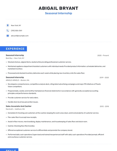 Build a professional seasonal internship resume in minutes. Browse through our resume examples to identify the best way to word your resume. Then choose from 5+ resume templates to create your seasonal internship resume.