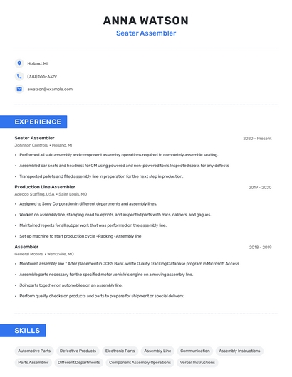 Build a professional seater assembler resume in minutes. Browse through our resume examples to identify the best way to word your resume. Then choose from 5+ resume templates to create your seater assembler resume.