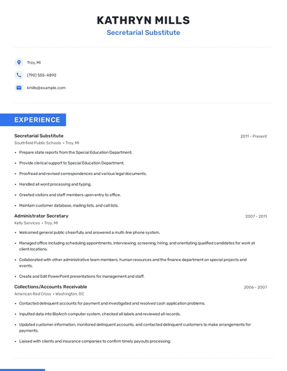 Build a professional secretarial substitute resume in minutes. Browse through our resume examples to identify the best way to word your resume. Then choose from 5+ resume templates to create your secretarial substitute resume.