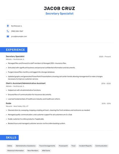 Build a professional secretary specialist resume in minutes. Browse through our resume examples to identify the best way to word your resume. Then choose from 5+ resume templates to create your secretary specialist resume.