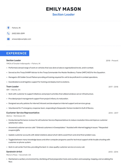 Build a professional section leader resume in minutes. Browse through our resume examples to identify the best way to word your resume. Then choose from 5+ resume templates to create your section leader resume.