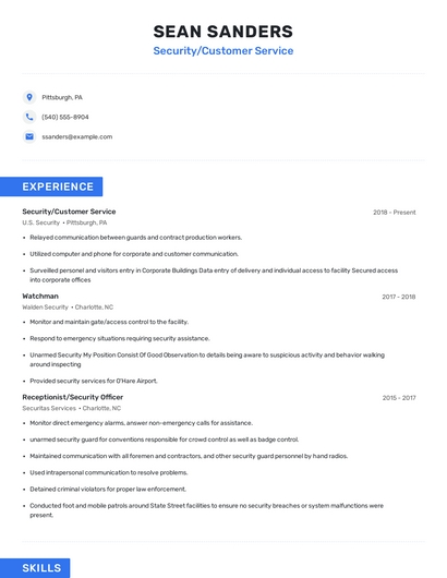 Build a professional security/customer service resume in minutes. Browse through our resume examples to identify the best way to word your resume. Then choose from 5+ resume templates to create your security/customer service resume.