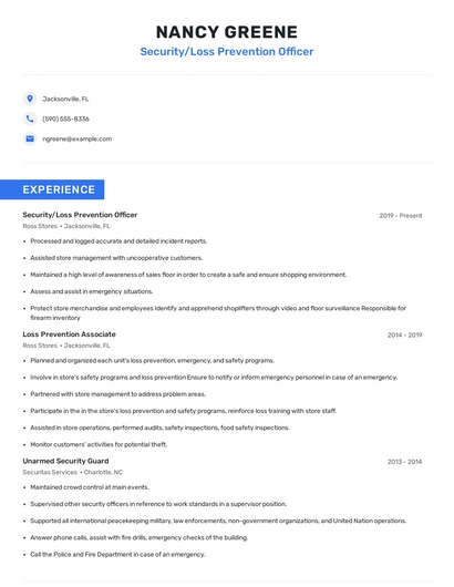 Build a professional security/loss prevention officer resume in minutes. Our AI resume writing assistant will guide you through every step of the process, and you can choose from 10+ resume templates to create your security/loss prevention officer resume.7. Incident Reports