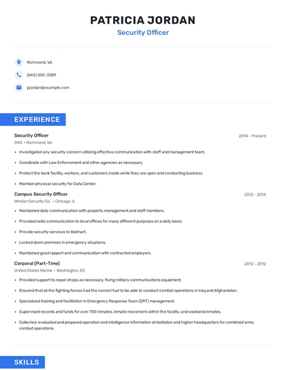 Build a professional security officer resume in minutes. Browse through our resume examples to identify the best way to word your resume. Then choose from 5+ resume templates to create your security officer resume.