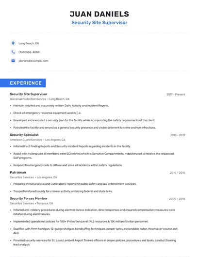 Build a professional security site supervisor resume in minutes. Our AI resume writing assistant will guide you through every step of the process, and you can choose from 10+ resume templates to create your security site supervisor resume.7. Patrol