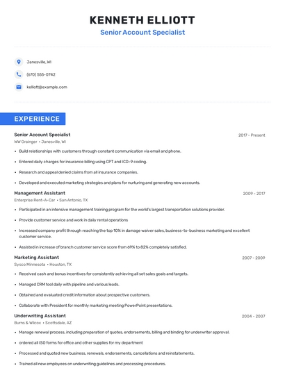 Build a professional senior account specialist resume in minutes. Browse through our resume examples to identify the best way to word your resume. Then choose from 5+ resume templates to create your senior account specialist resume.