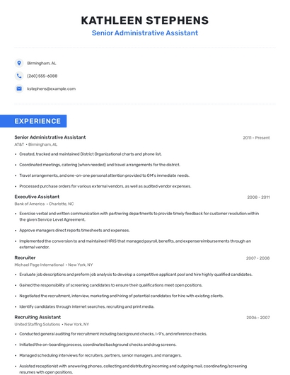Build a professional senior administrative assistant resume in minutes. Browse through our resume examples to identify the best way to word your resume. Then choose from 5+ resume templates to create your senior administrative assistant resume.