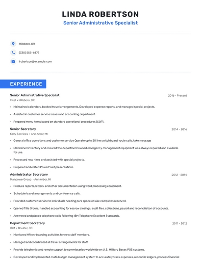 Build a professional senior administrative specialist resume in minutes. Browse through our resume examples to identify the best way to word your resume. Then choose from 5+ resume templates to create your senior administrative specialist resume.