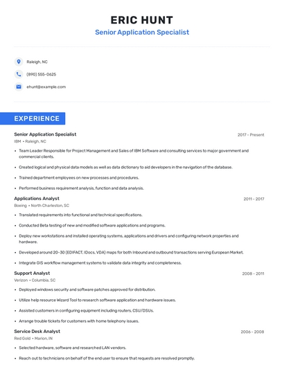 Build a professional senior application specialist resume in minutes. Browse through our resume examples to identify the best way to word your resume. Then choose from 5+ resume templates to create your senior application specialist resume.