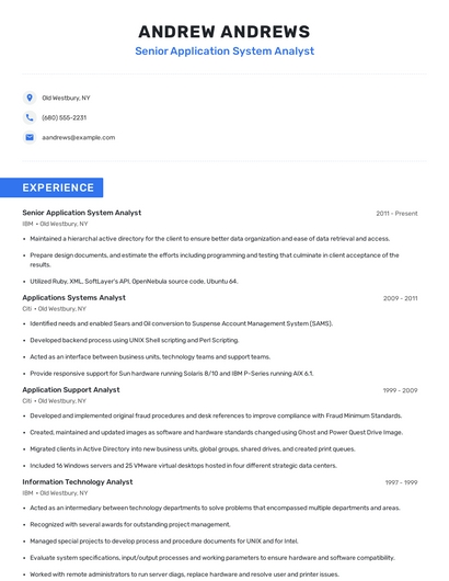 Build a professional senior application system analyst resume in minutes. Browse through our resume examples to identify the best way to word your resume. Then choose from 5+ resume templates to create your senior application system analyst resume.