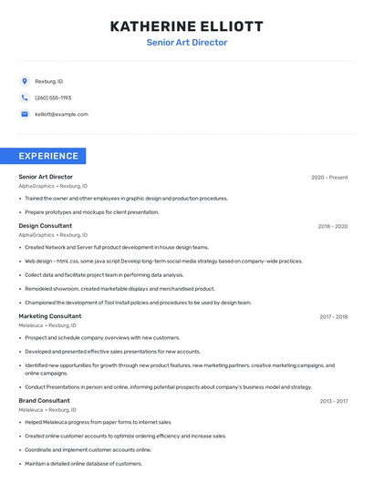 Build a professional senior art director resume in minutes. Browse through our resume examples to identify the best way to word your resume. Then choose from 5+ resume templates to create your senior art director resume.