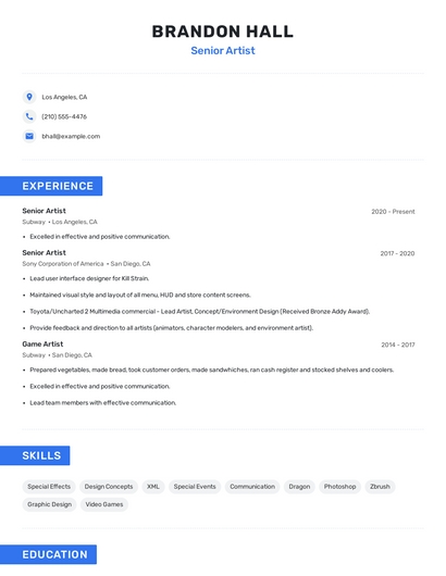 Build a professional senior artist resume in minutes. Browse through our resume examples to identify the best way to word your resume. Then choose from 5+ resume templates to create your senior artist resume.