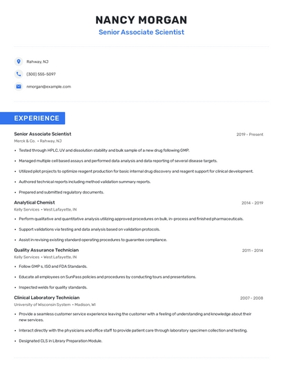 Build a professional senior associate scientist resume in minutes. Browse through our resume examples to identify the best way to word your resume. Then choose from 5+ resume templates to create your senior associate scientist resume.