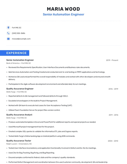 Build a professional senior automation engineer resume in minutes. Our AI resume writing assistant will guide you through every step of the process, and you can choose from 10+ resume templates to create your senior automation engineer resume.7. GIT